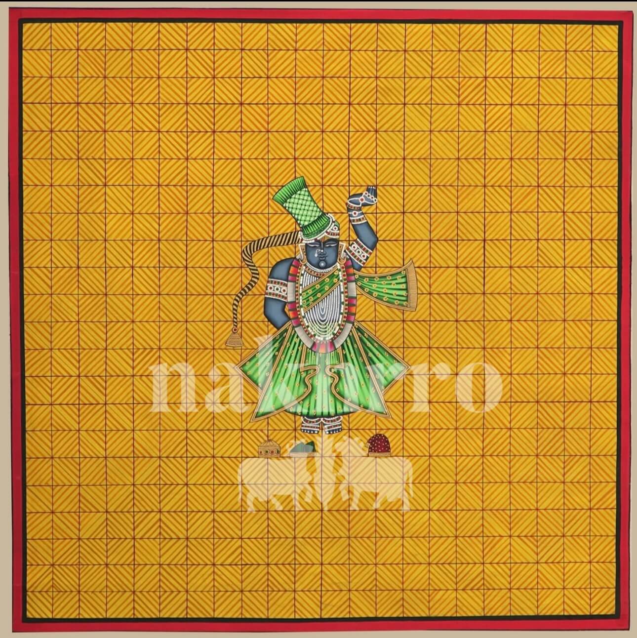Original Shrinathji Pichwai – Hand-Painted on Cotton Cloth | Yellow Geometric Grid with Green Attire