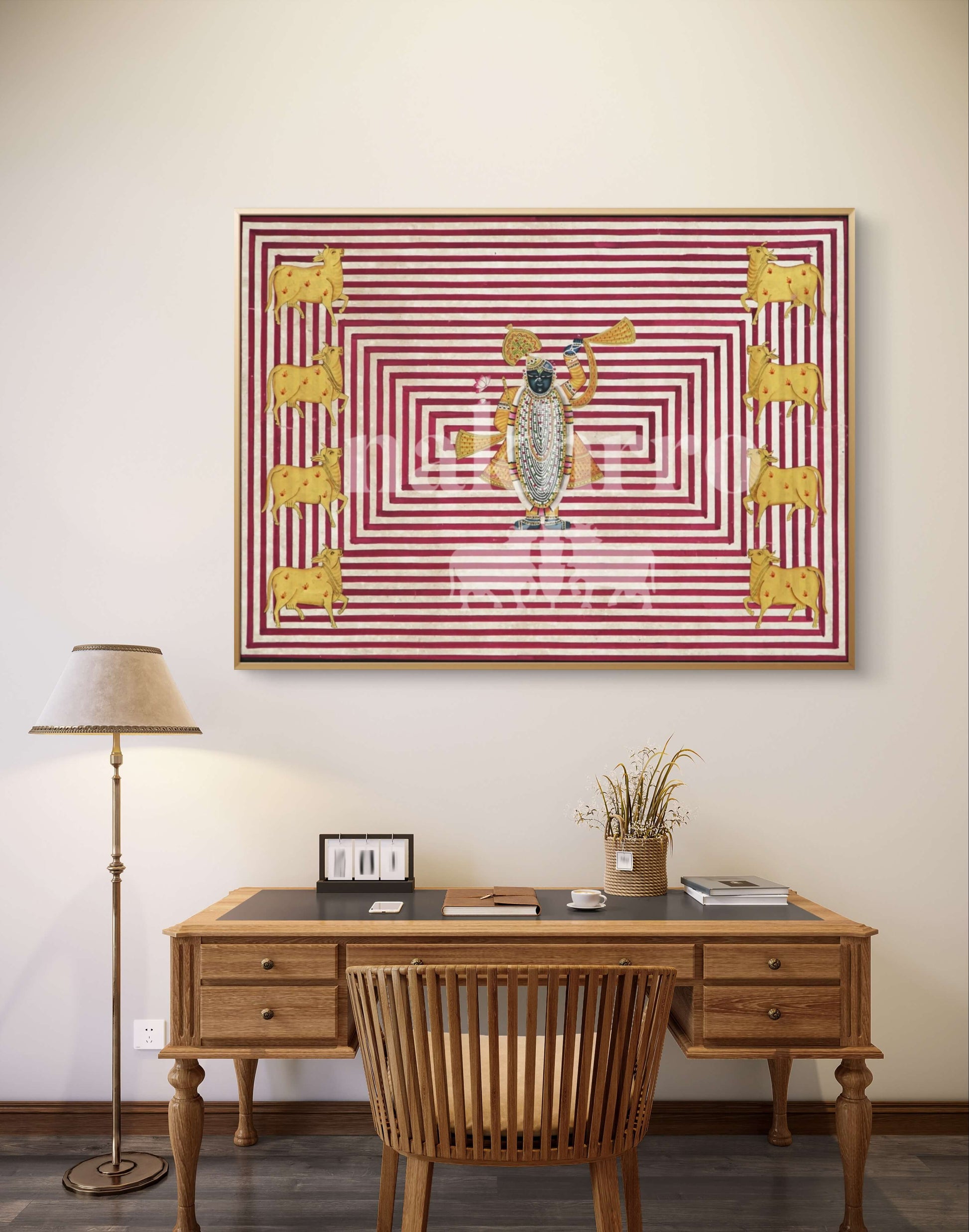 This 18x18 inch Shrinathji Pichwai brings together sacred form and graphic precision.