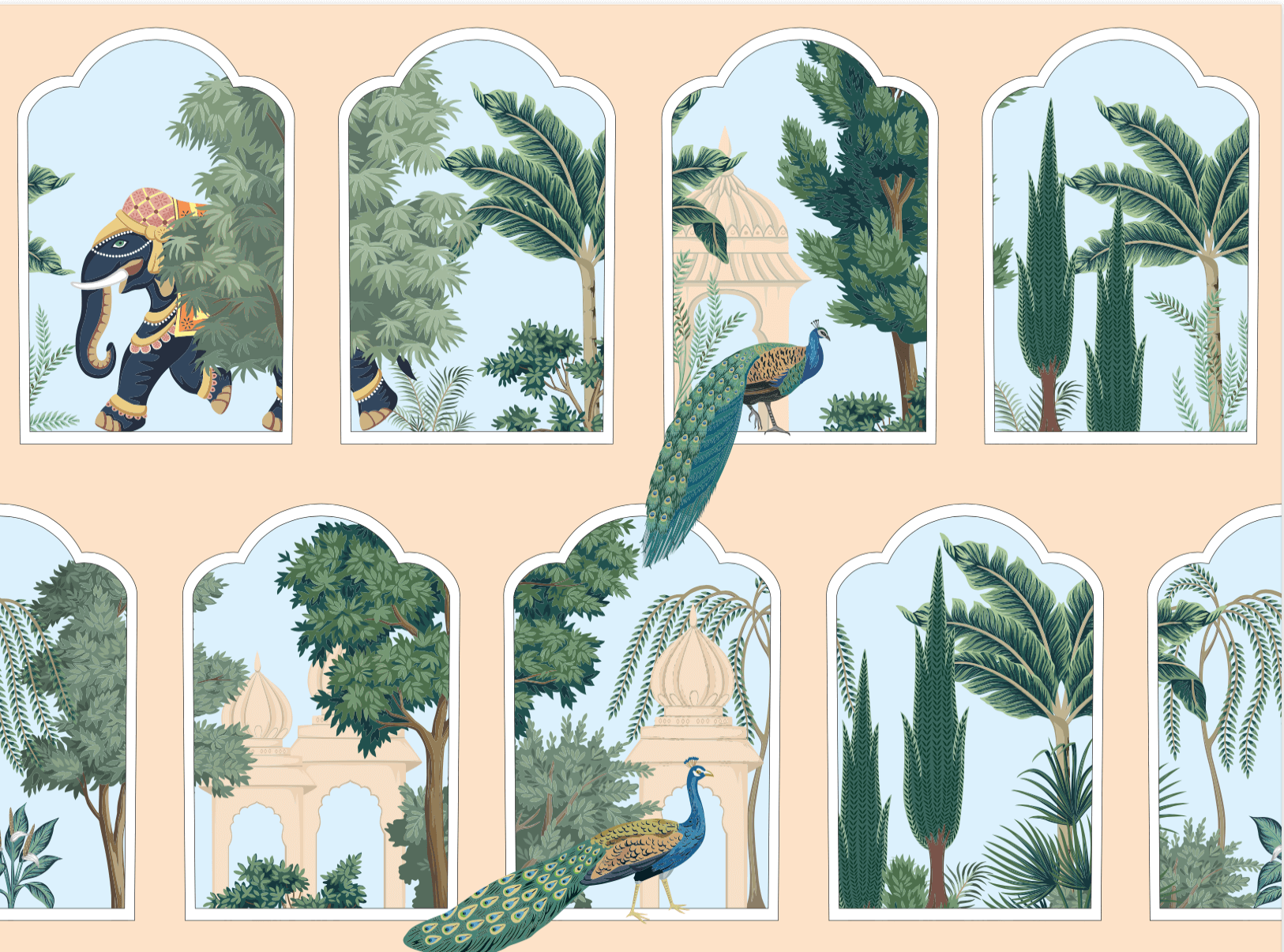Peacock & Elephant Jungle Courtyard – Indian Palace Wall Art Print