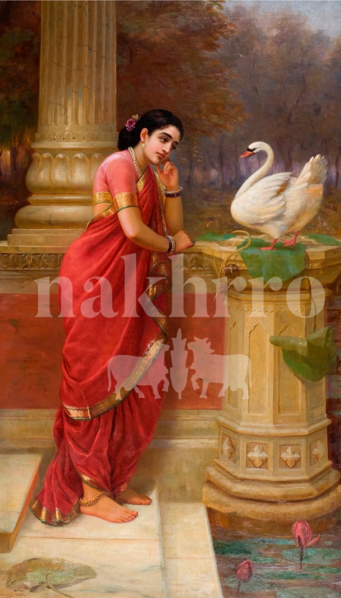 Graceful, contemplative, and deeply evocative, this museum-grade art print captures a classic Indian beauty draped in red silk, lost in thought beside a swan. This composition reflects a quiet moment of romance and reflection, set against an architectural garden backdrop.