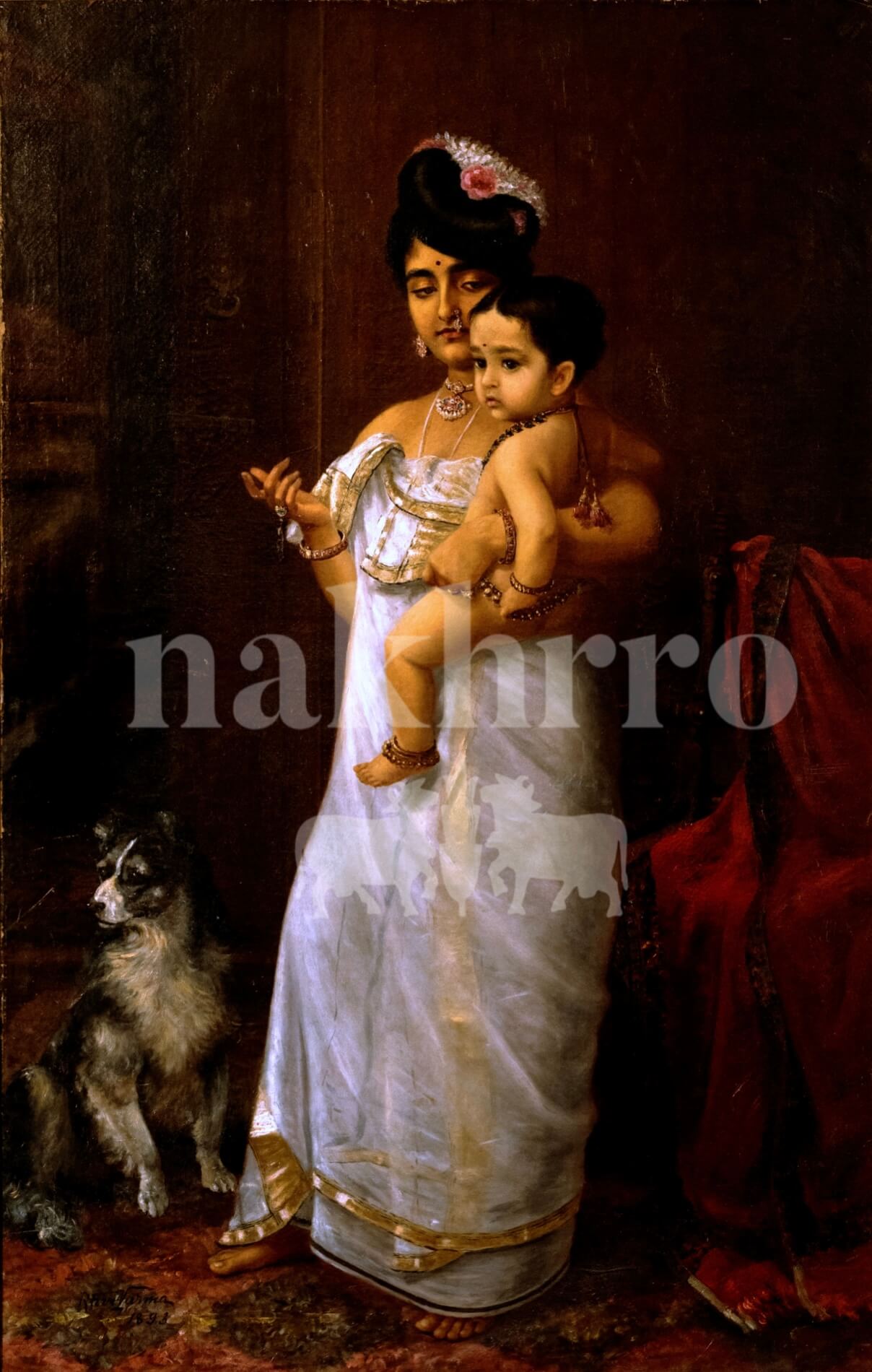Step into a timeless moment of maternal grace with this museum-grade archival art print inspired by the iconic style of Raja Ravi Varma. Depicting a regal Indian woman in a white saree with gold trim, holding her child close as a loyal dog sits by her side, this artwork beautifully blends European realism with Indian tradition.