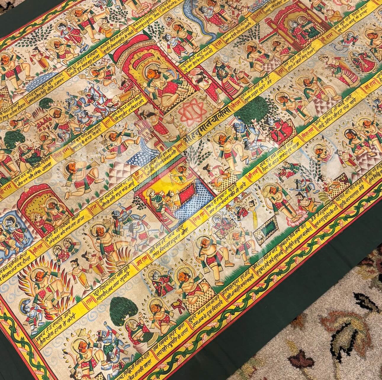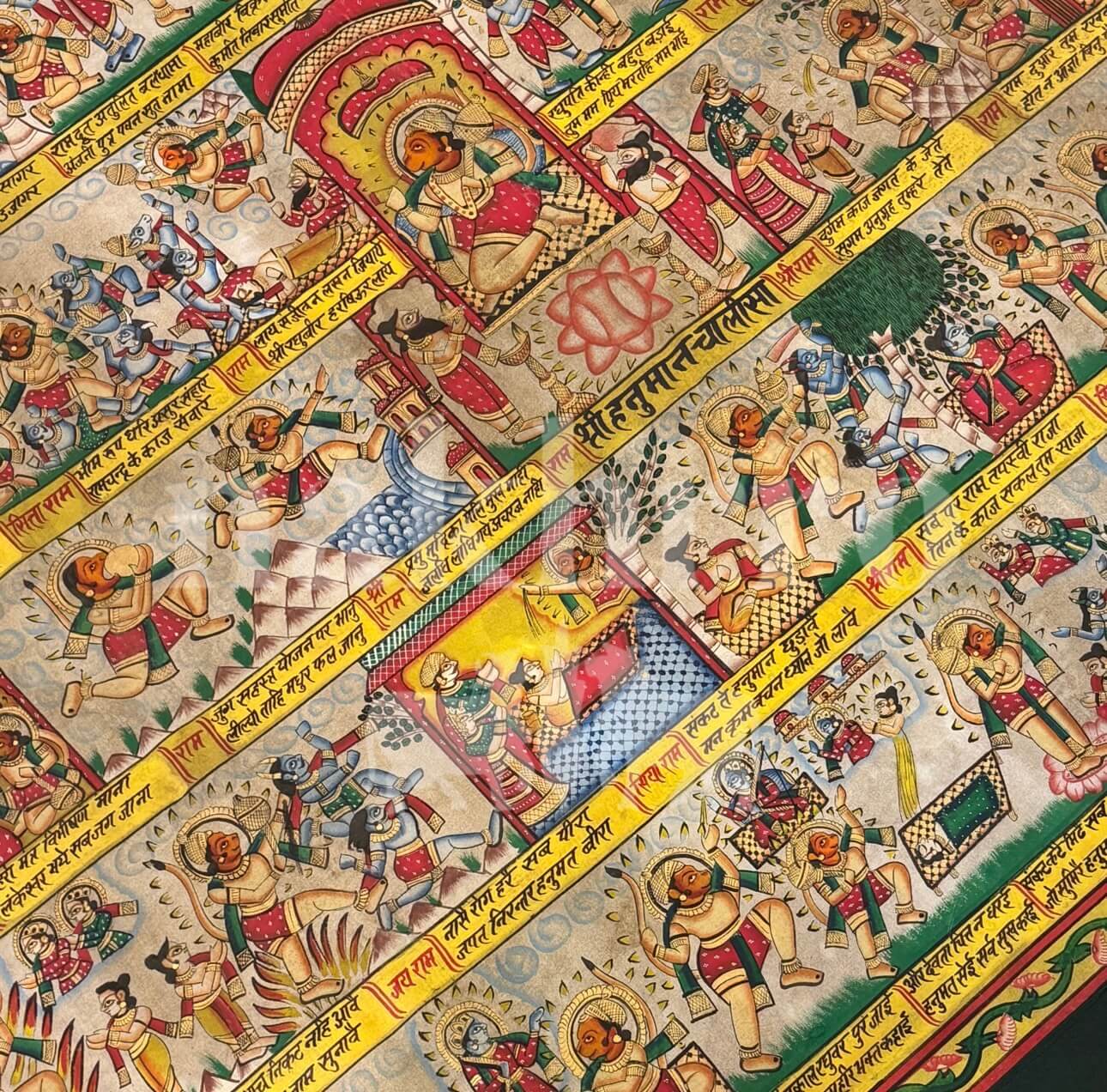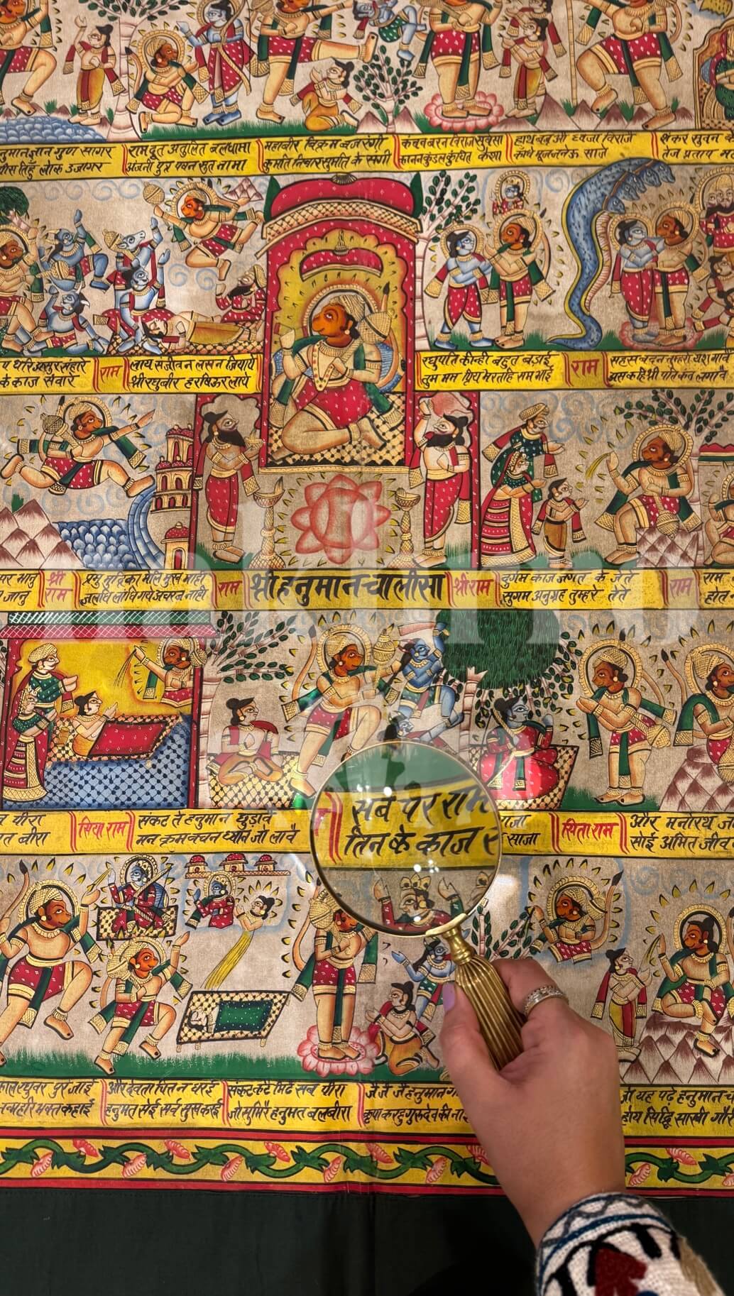 This museum-grade archival print visually brings to life all 40 verses of the Hanuman Chalisa in an intricate, story-based format. Originally hand-painted with folk motifs, this reproduction is crafted using archival pigment inks on acid-free, textured fine-art paper or canvas, offering you the same richness as a hand-painted original—with the durability to last over 80 years.