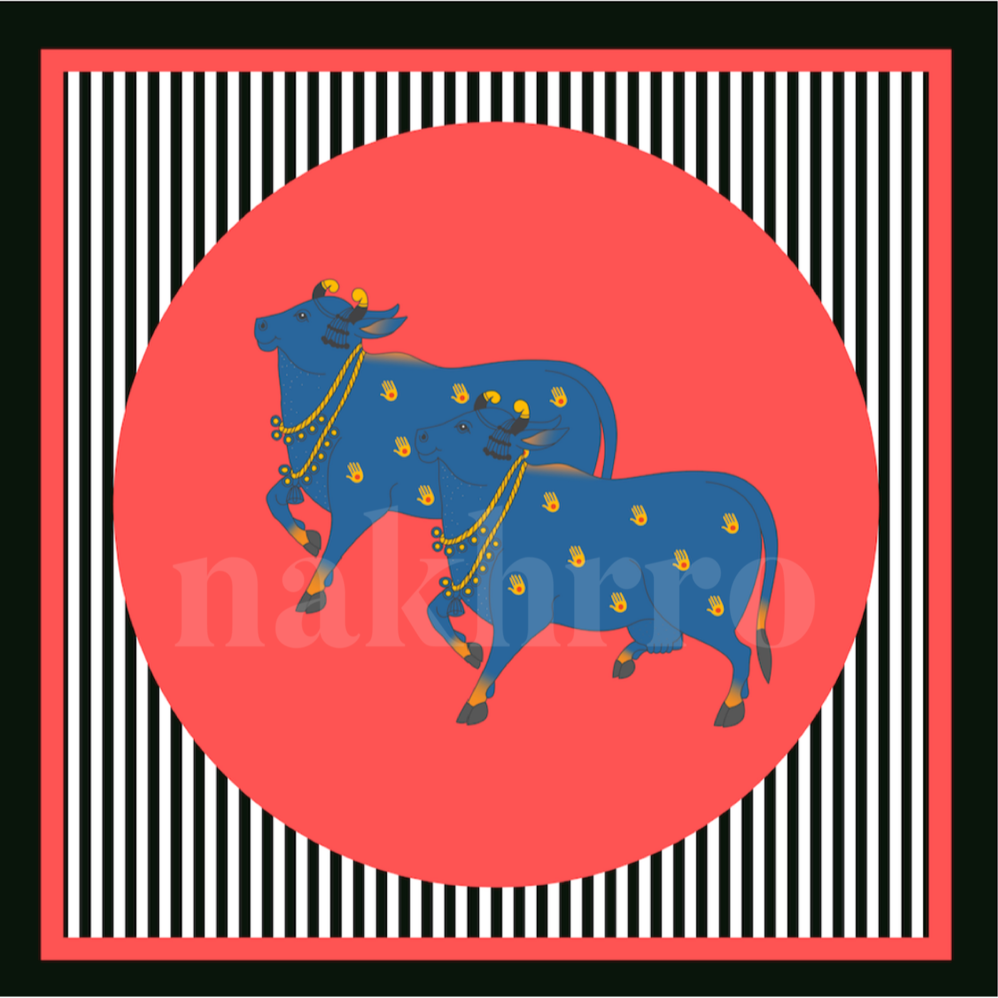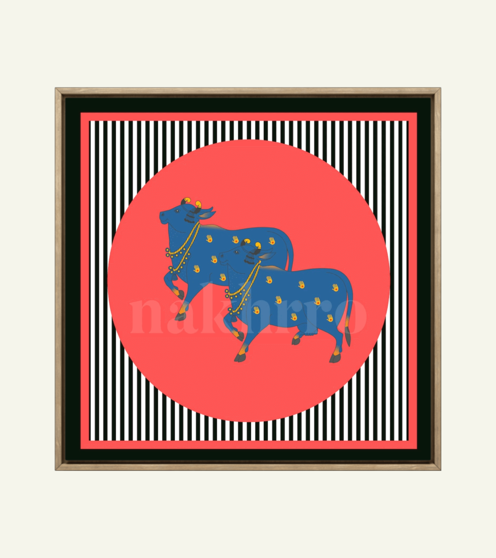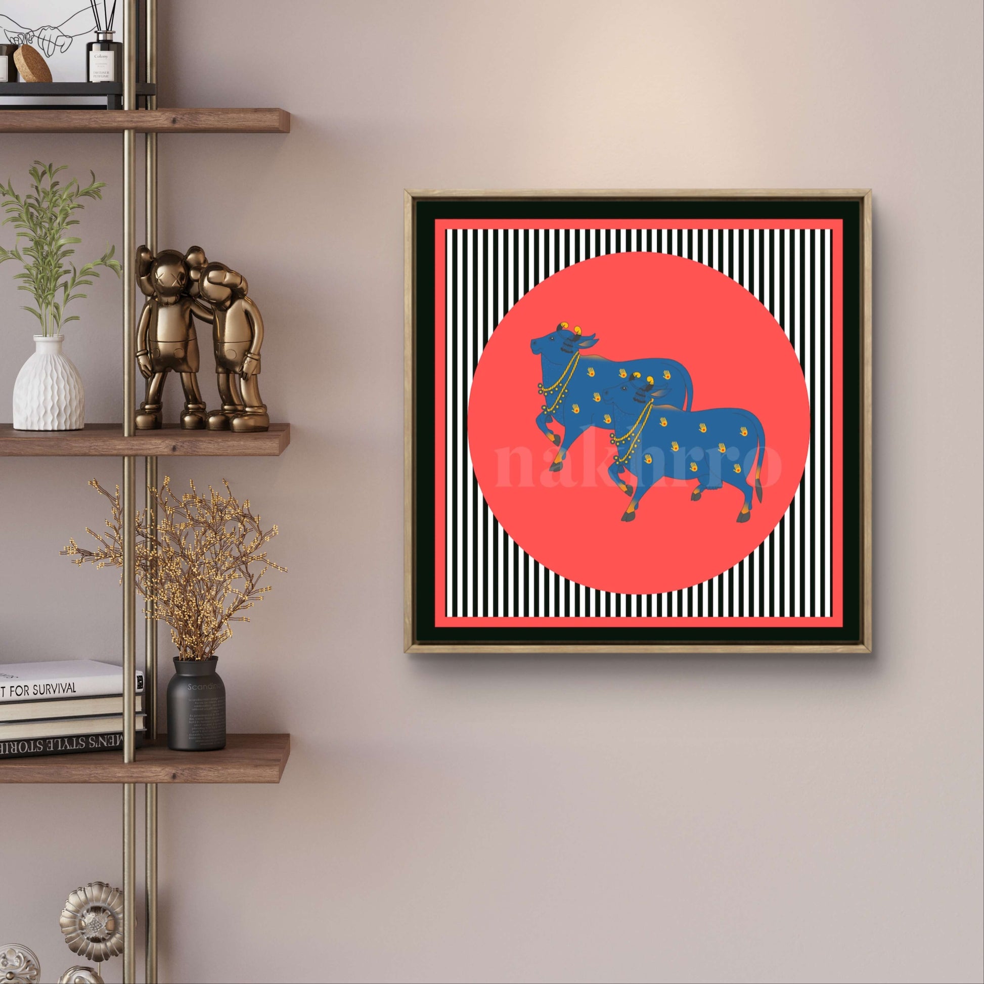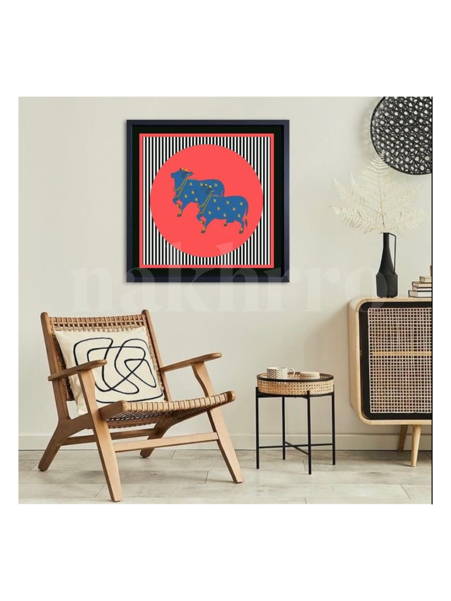 Meet our Pop Culture Kamdhenu, a reimagined version of the divine cow goddess in a striking red backdrop and electric blue body. This piece fuses Indian mythology with modern design aesthetics, making it a conversation starter for any space.