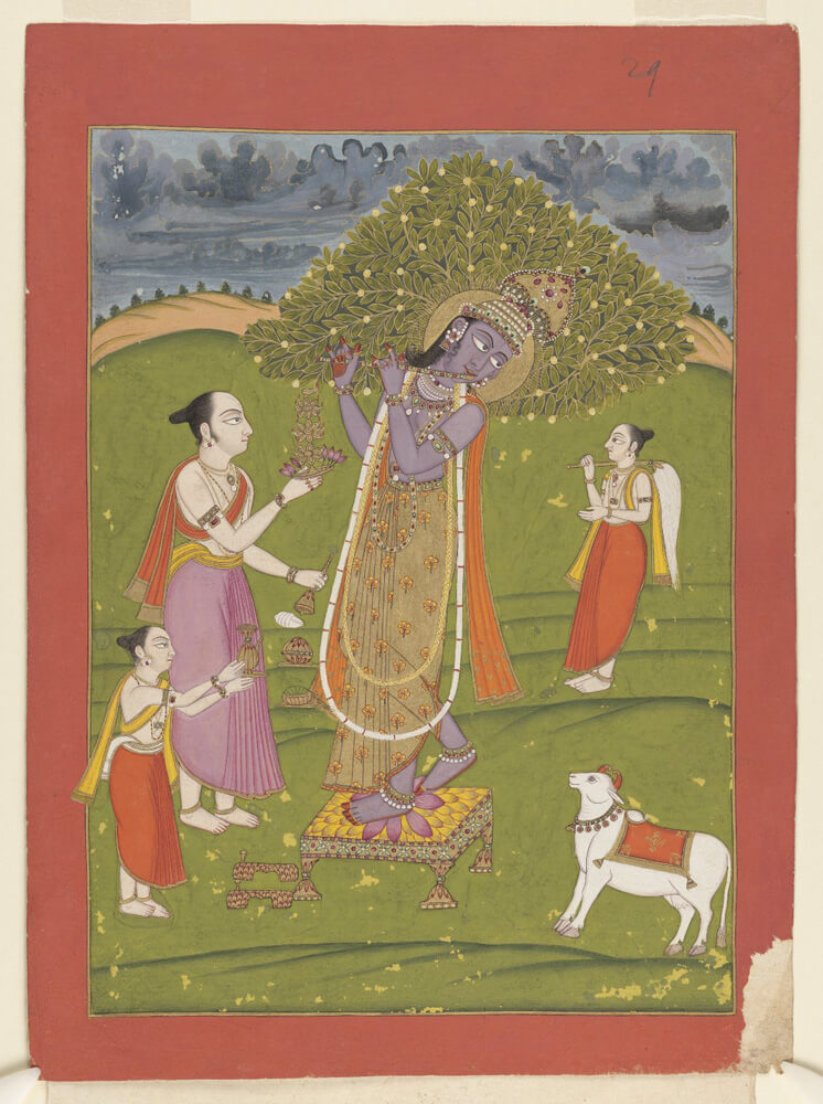 This archival print captures Lord Krishna mid-worship, as attendants garland him and offer incense amidst the rolling hills of Gokul. A serene cow stands nearby, and celestial musicians accompany the moment with quiet reverence. It’s a painting of devotion—but not grandeur. Here, Krishna is not on a throne, but a simple pedestal—surrounded by nature, bhakti, and beauty.