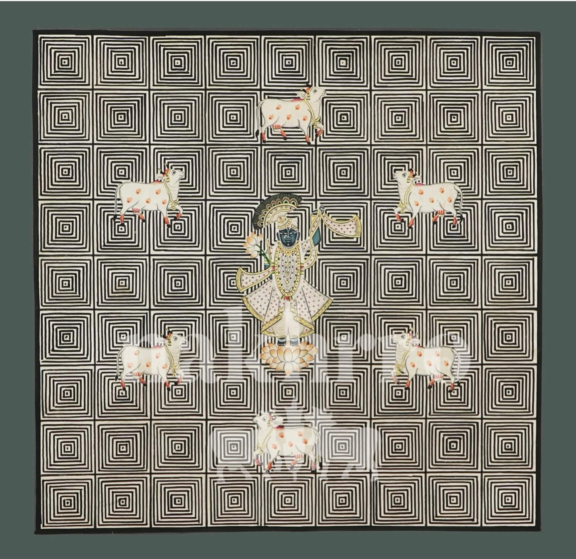 Original Shrinathji Pichwai with Cows – Hand-Painted on Cotton | Black & White Optical Grid